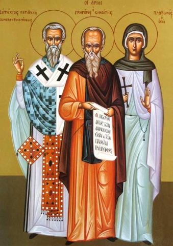 | | | Άγιοι Ευτύχιος Πατριάρχης Κωνσταντινούπολης, Γρηγόριος ο Σιναϊτης και Πλατωνίς |