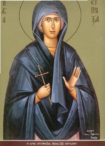 Ήταν κόρη του συγκλητικού Αντίγονου και συγγενής του Μεγάλου Θεοδοσίου. Μετά τον θάνατο του Αντιγόνου, η μητέρα της την παρέδωσε στον βασιλιά Θεοδόσιο για να την αποκαταστήσει. Αυτός την αρραβώνιασε πολύ μικρή με κάποιον συγκλητικό. Αλλά κατά τη διάρκεια κάποιας περιήγησης της στην Αίγυπτο, με τη συνοδεία της μητέρας της, η Ευπραξία επισκέφθηκε κάποια γυναικεία Μονή στη Θήβα της Άνω Αιγύπτου και τόσο της άρεσε η ζωή των εκεί ασκουμένων, ώστε αποφάσισε να περάσει το υπόλοιπο της ζωής της μαζί μ' αυτές. Η Ευπραξία, μοίρασε τα χρήματα αυτά στις εκκλησίες και στους φτωχούς και επιδόθηκε σε αυστηρότατη άσκηση για 45 ολόκληρα χρόνια. Έτσι ασκητικά και άγια αφού έζησε, παρέδωσε ειρηνικά το πνεύμα της στον Θεό, επιτελώντας πολλά θαύματα.