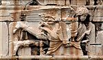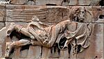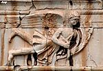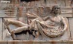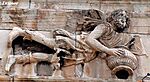Ο Εύρος (Σιρόκος), ισχυρότατος άνεμος, όπως δείχνουν τ’ ακατάστατα ρούχα του, που στο Αιγαίο φέρνει φοβερές φουρτούνες. Όταν είναι ήπιος, φέρνει υγρασία και καταχνιά, κάτι που υποδηλώνει το καλυμμένο χέρι του και ο μανδύας, που κρύβει το πρόσωπό του.