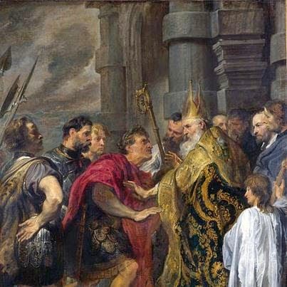 | | | Ο Άγιος Αμβρόσιος απαγορεύει την είσοδο στο ναό στον αυτοκράτορα Θεοδόσιο τον Μέγα για το φόνο που διέπραξε στον Ιππόδρομο Θεσσαλονίκης |