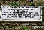 | | | Αναμνηστική πινακίδα που τοποθετήθηκε, από Έλληνες πολίτες, έξω από την σπηλιά στην οποία κρυβόταν ο αφορισθείς μητροπολίτης. |