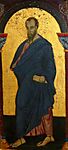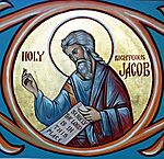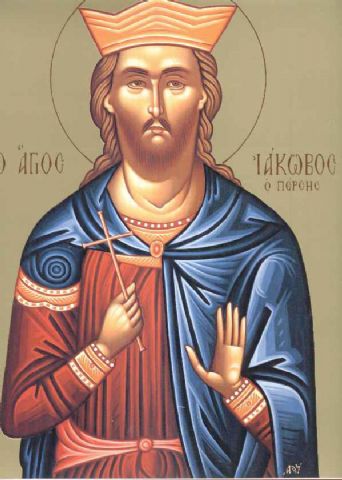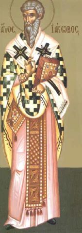 Ιάκωβος ο αδελφόθεος, αδελφός του Χριστού και γιος του Ιωσήφ του Μνήστορος, πρώτος Ιεράρχης Ιεροσολύμων. Είναι αυτός που έγραψε την πρώτη Θεία Λειτουργία της χριστιανικής Εκκλησίας. Μαρτύρησε στα χέρι