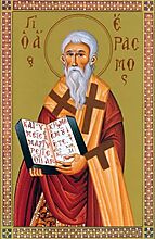 Ο Άγιος Μάρτυρας Έρασμος μαρτύρησε μαζί με άλλους δεκατέσσερις επί αυτοκράτορα Δεκίου (249 - 251 μ.Χ.), μεταξύ των οποίων οι Ονήσιμος, Αλφειός, Κυπρίνος και Φιλάδελφος.