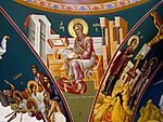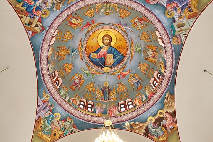 | | | | Αγιογραφία στο σφαιρικό τρίγωνο του τρούλλου του ναού | Φαίνεται ότι στους ναούς μας, η αγιογράφηση των τεσσάρων Ευαγγελιστών γίνεται στις τέσσερις μεγάλες κόγχες που δημιουργούνται στη βάση των τεσσάρων τόξων, επί των οποίων στηρίζεται ο τρούλλος. |