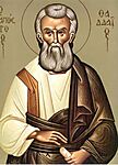 Εβραίος από την Έδεσσα ο Απόστολος Θαδδαίος, γνωστός και ως Λεββαίος, πολύ μορφωμένος στις θείες Γραφές, είχε ανεβεί στην Ιερουσαλήμ για προσκύνημα την εποχή του Ιωάννη του Βαπτιστή. Όταν άκουσε το κήρυγμα του και είδε την αγγελική του ζωή, τόσο πολύ εντυπωσιάστηκε, ώστε επεδίωξε και βαπτίστηκε απ' αυτόν. Μετά, όταν άκουσε τη διδασκαλία και είδε τα θαύματα του Ιησού Χριστού, τον ακολούθησε μέχρι το σωτήριο Πάθος. Ο Θαδδαίος κήρυξε το Ευαγγέλιο στη Μεσοποταμία (σημερινό Ιράκ), όπου και έτυχε μαρτυρικού θανάτου.