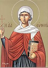 Γεννήθηκε στη Χαλκηδόνα από οικογένεια θεοσεβή και ευγενική. Οι γονείς της Ψιλόφρων και Θεοδωριανή φρόντισαν ώστε η Θυγατέρα τους να αναπτύξει κάθε χριστιανική αρετή. Η Ευφημία εξελίχθηκε σε άνθρωπο με σπάνια χαρίσματα και δυνατό χριστιανικό φρόνημα, το οποίο επέδειξε όταν ο ειδωλολάτρης ανθύπατος της Μικράς Ασίας Πρίσκος διέταξε να παρευρεθούν όλοι οι κάτοικοι της Χαλκηδόνας σε γιορτή, την οποία οργάνωνε προς τιμή του θεού των ειδωλολατρών Άρη. Τότε η Ευφημία αποφάσισε μαζί με άλλους χριστιανούς να απέχει από τη γιορτή των ειδωλολατρών και για το λόγο αυτό συνελήφθη και φυλακίσθηκε.