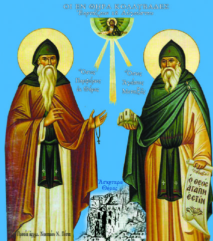 Iδρυτές του απόκρημνου Ασκηταριού στα άκρα του Μέσα Βουνού, ανάμεσα από τους όρμους Περίσσιας και Καμαρίου Θήρας.