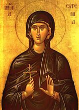 Η Αγία Ευγενία η Οσιοπαρθενομάρτυς έζησε στο δεύτερο μισό του 3ου αιώνα μ.Χ. Καταγόταν από τη Ρώμη, γόνος πλούσιας οικογένειας αξιωματούχου πατέρα. Εκείνη την περίοδο, οι γονείς της ήθελαν να τη δώσουν σύζυγο σε κάποιο Ρωμαίο αξιωματούχο, τον Ακυλίνα. Τότε η Ευγενία, αρνούμενη να δεχθεί αυτή την πρόταση των γονέων της, κάποια νύχτα ντύθηκε ανδρικά και έφυγε σε άλλη πόλη. Εκεί κατηχήθηκε, βαπτίσθηκε χριστιανή και έλαβε συγχρόνως το μοναχικό σχήμα. Μετά από χρόνια, επέστρεψε στο σπίτι της και η αναγνώριση από τους γονείς της έγινε μέσα σε δάκρυα και ανέκφραστη χαρά. Δεν πέρασε πολύς καιρός και όλοι στο σπίτι της Ευγενίας δέχθηκαν το χριστιανισμό. Από μίσος τότε οι ειδωλολάτρες τραυμάτισαν θανάσιμα τον πατέρα της. Και όταν η Ευγενία επέστρεψε στη Ρώμη, επειδή δεν θυσίαζε στα είδωλα, την αποκεφάλισαν.