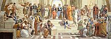 1: Ζήνων ο Κιτιεύς 2: Επίκουρος 3: Φεδερίκος II, Δούκας της Μάντοβα 4: Αναξίμανδρος ή Εμπεδοκλής; 5: Αβερρόης 6: Πυθαγόρας 7: Αλκιβιάδης ή ο Αλέξανδρος ο Μέγας; 8: Αντισθένης ή ο Ξενοφών; 9: Υπατία(Ραφαήλ) 10: Αισχίνης ή ο Ξενοφών; 11: Παρμενίδης; 12: Σωκράτης 13: Ηράκλειτος (Μιχαήλ Άγγελος) 14: Πλάτων (Λεονάρντο Ντα Βίντσι) 15: Αριστοτέλης 16: Διογένης της Σινώπης 17: Πλωτίνος 18: Ευκλείδης ή Αρχιμήδης (Μπραμάντε) 19: Ζωροάστρης 20: Κλαύδιος Πτολεμαίος; R: Απελλής 21: Πρωτογένης
