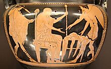 Οι φτερωτοί Βορεάδες (αριστερά και δεξιά) διασώζουν τον Φινέα (καθιστό) από τις Άρπυιες.