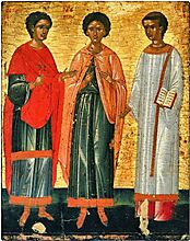 Tριάδος ἰσάριθμοι τῆς Ὑπερθέου, σαφῶς Γουρίας καὶ Ἄβιβος καὶ Σαμωνᾶς ὁ κλεινός, ἔνθεοι ὑπάρχοντες ταύτην τοῖς ἀσεβέσιν ὡμολόγησαν ἅμα ἄθλων τὴν τρικυμίαν ἀβλαβῶς διελθόντες· καὶ νῦν ἡμᾶς κυβερνῶσιν ὅρμον πρὸς ἄκλυστον.